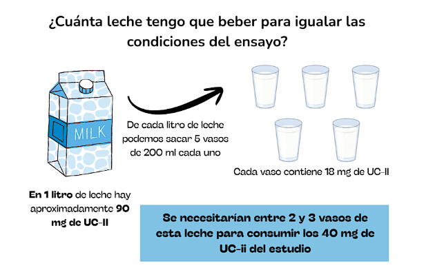 La etiqueta de esta leche indica “extracto de colágeno nativo tipo II (0,009%)”. Eso equivale a más o menos 90 mg por litro, alrededor de 20 mg por vaso (250 ml). Los ensayos con UC-II han usado 40 mg/día; por tanto, 2 vasos/día te acercan al rango de estudio*