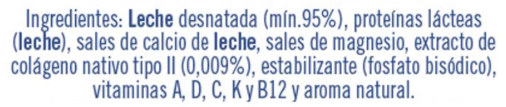 En ensayos y revisiones, colágeno y UC-II han mostrado buena tolerancia; eventos adversos similares a placebo, por lo que, un consumo habitual (2-3 vasos al día) no se espera que genere ningún problema aparente. Como contiene leche (obvio), hay que tener especial cuidado en alergias e intolerancias, incluida la lactosa. El UC-II suele proceder de cartílago de pollo; no se declara como alérgeno, pero si hay alergia a ave/colágeno específico, mejor precaución. No podemos encontrar esta información a simple vista en el embalaje, ni tampoco hay datos de ello en otras fuentes.